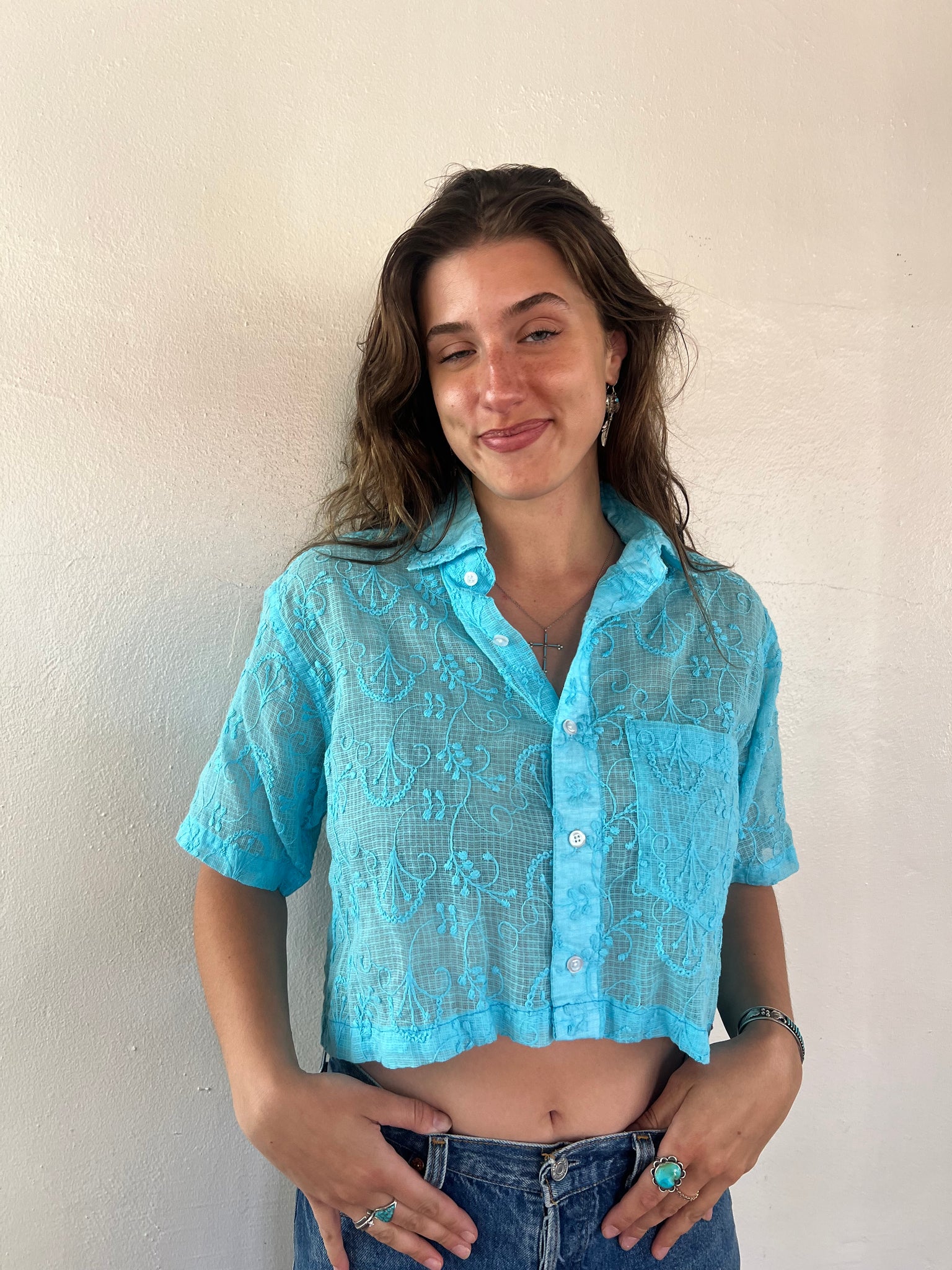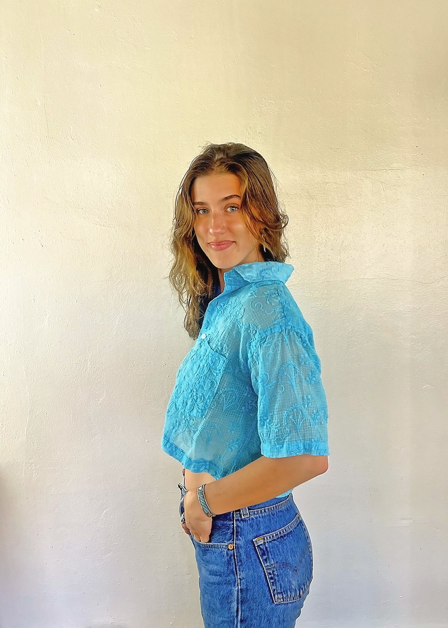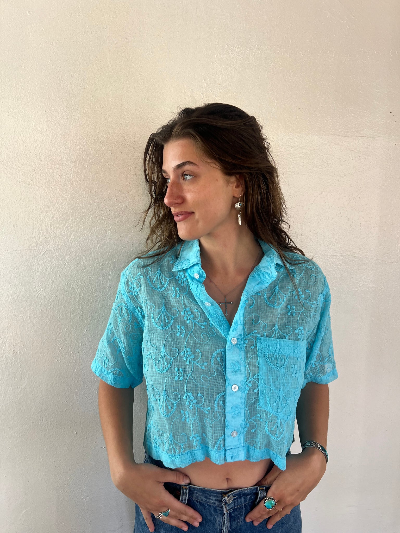 This crop is one of my all time faves. It can really be worn in a variety of ways. Sheer blue dream.