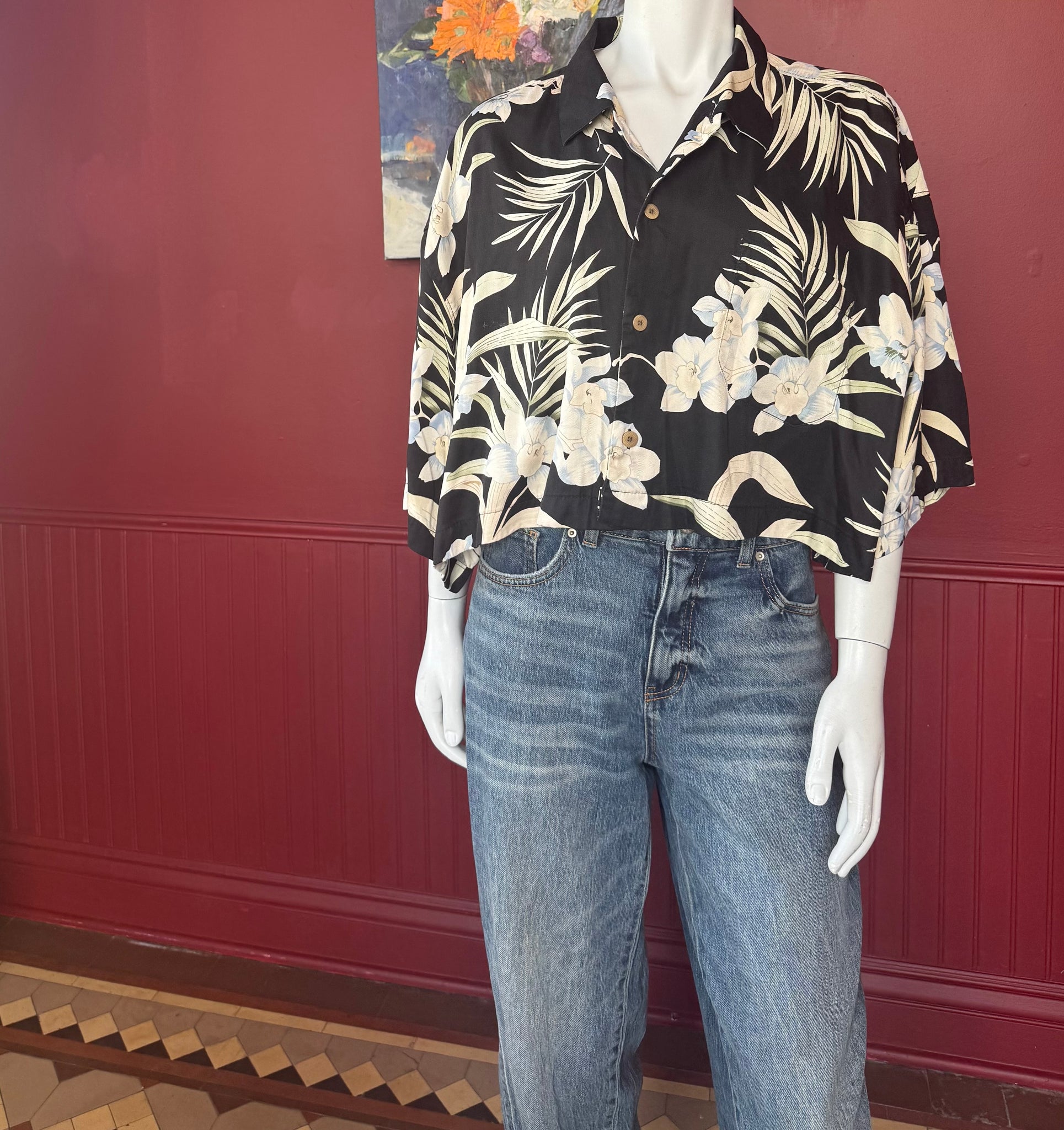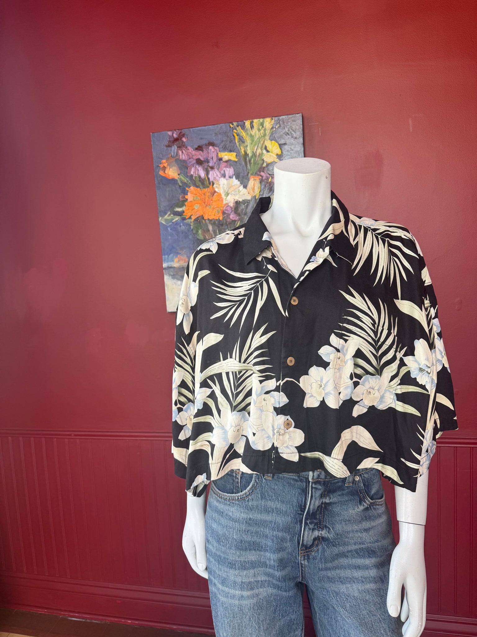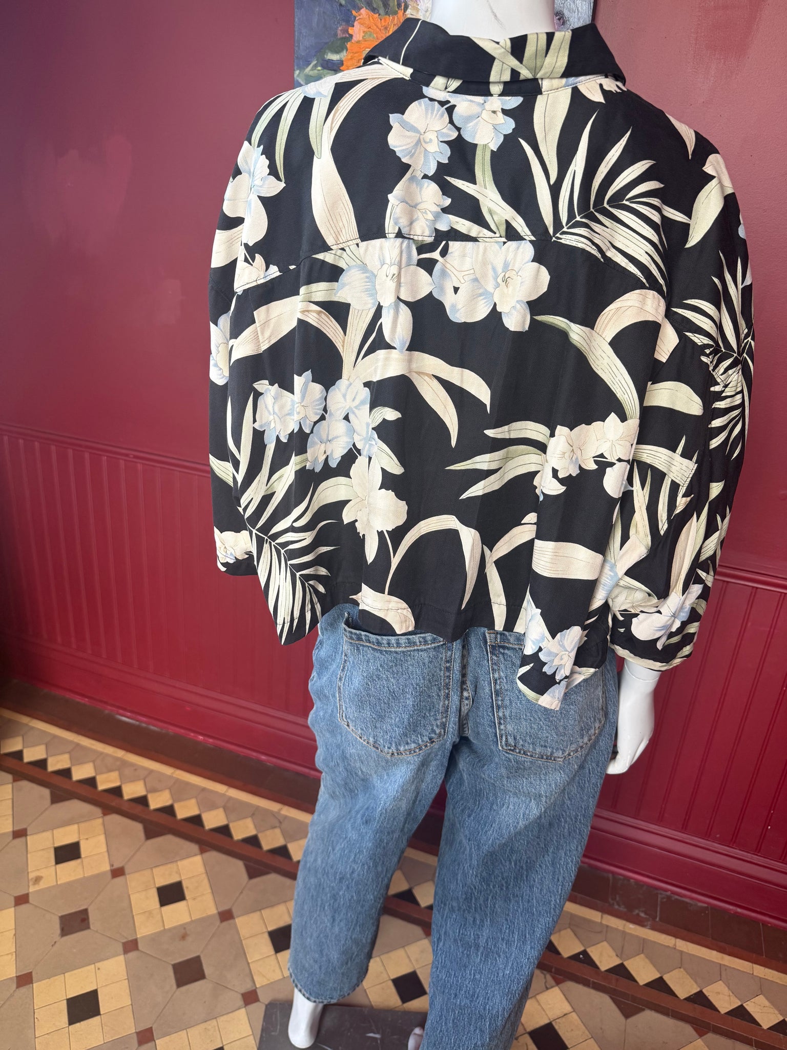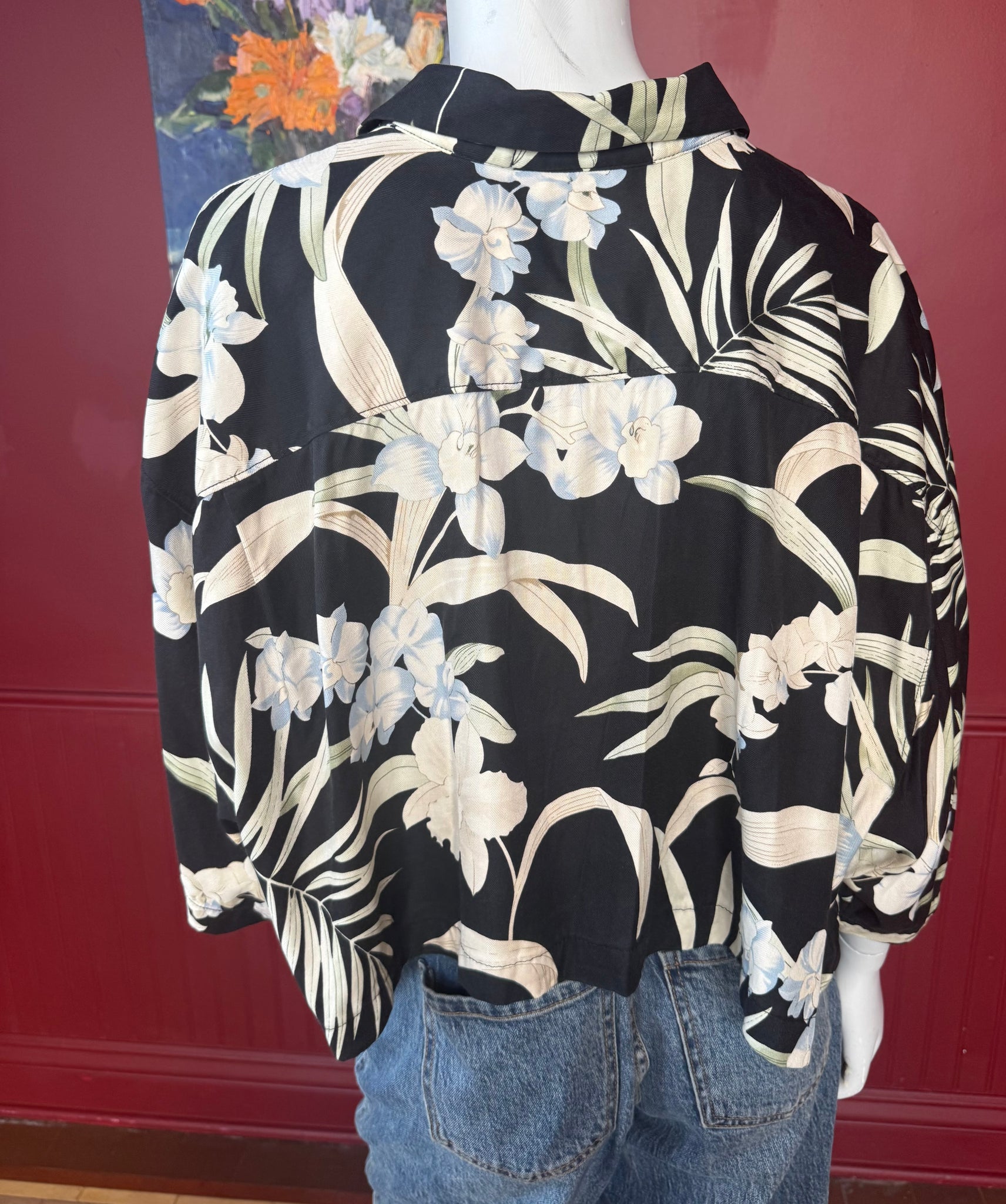 A beautiful black silk tropical print by Tommy Bahama. This one is ultra boxy, and versatile. The drape is wonderful, colors unique, goes with everything.