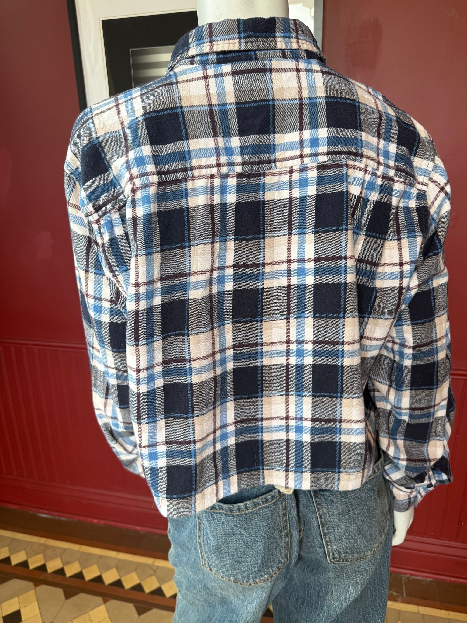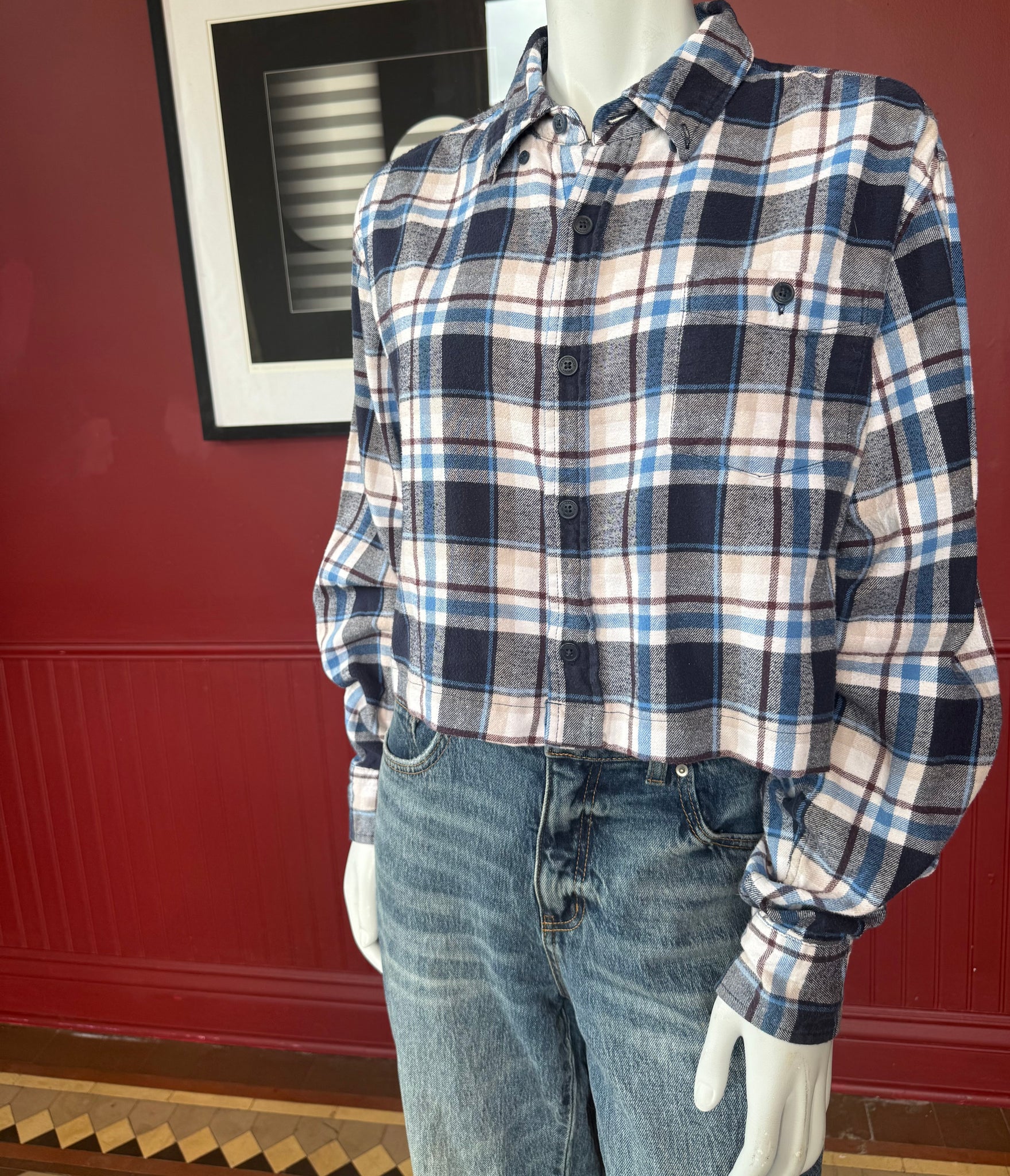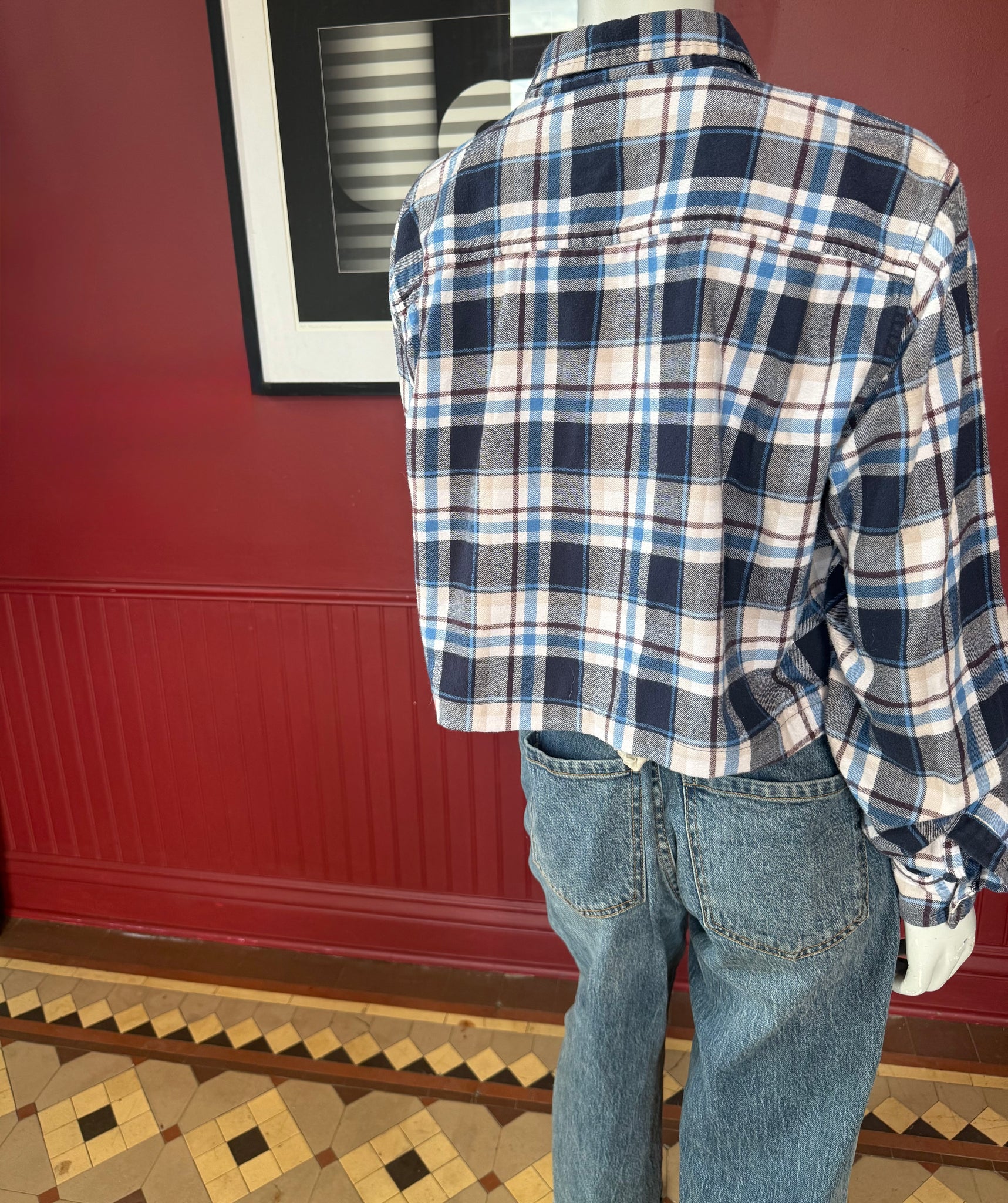 Another classic flannel white blue brown plaid. Wear it over a T-shirt as a cropped jacket or on its own.
