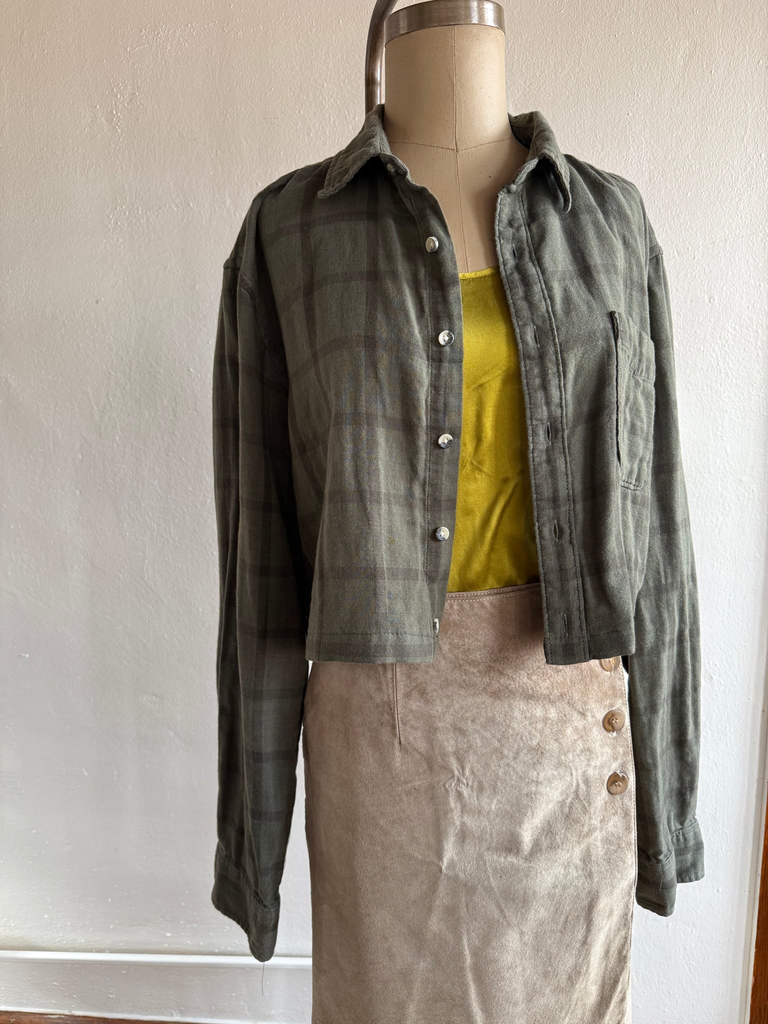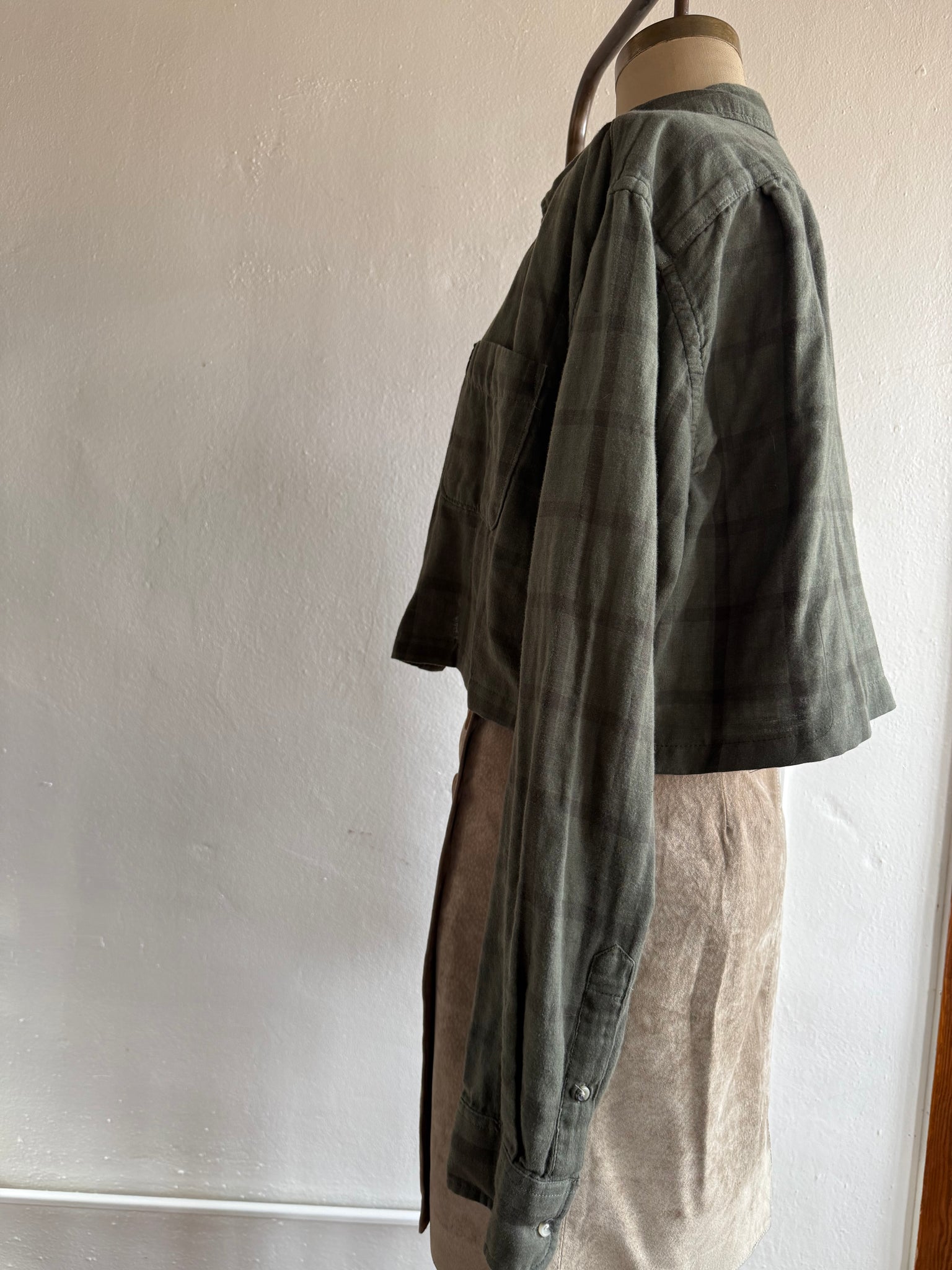This double faced plaid flannel long sleeved crop is a wonderful light jacket for layering.