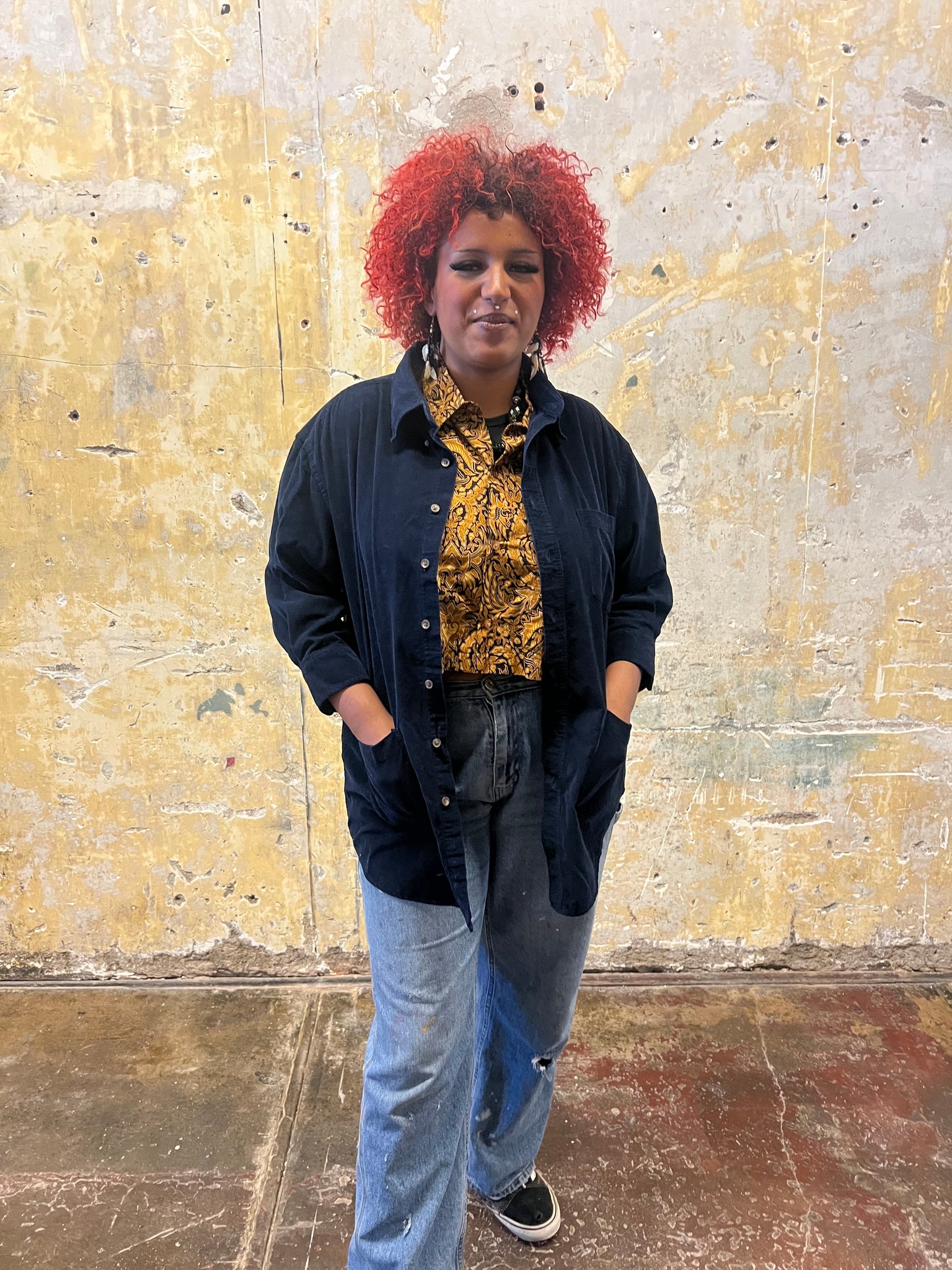 This garment started as a mens shirt. It was dissected at the sleeves to accommodate 2 new hip pockets. The sleeves were then reshaped for a more feminine silhouette. This chore coat is a timeless staple for the adventurous, creative person.