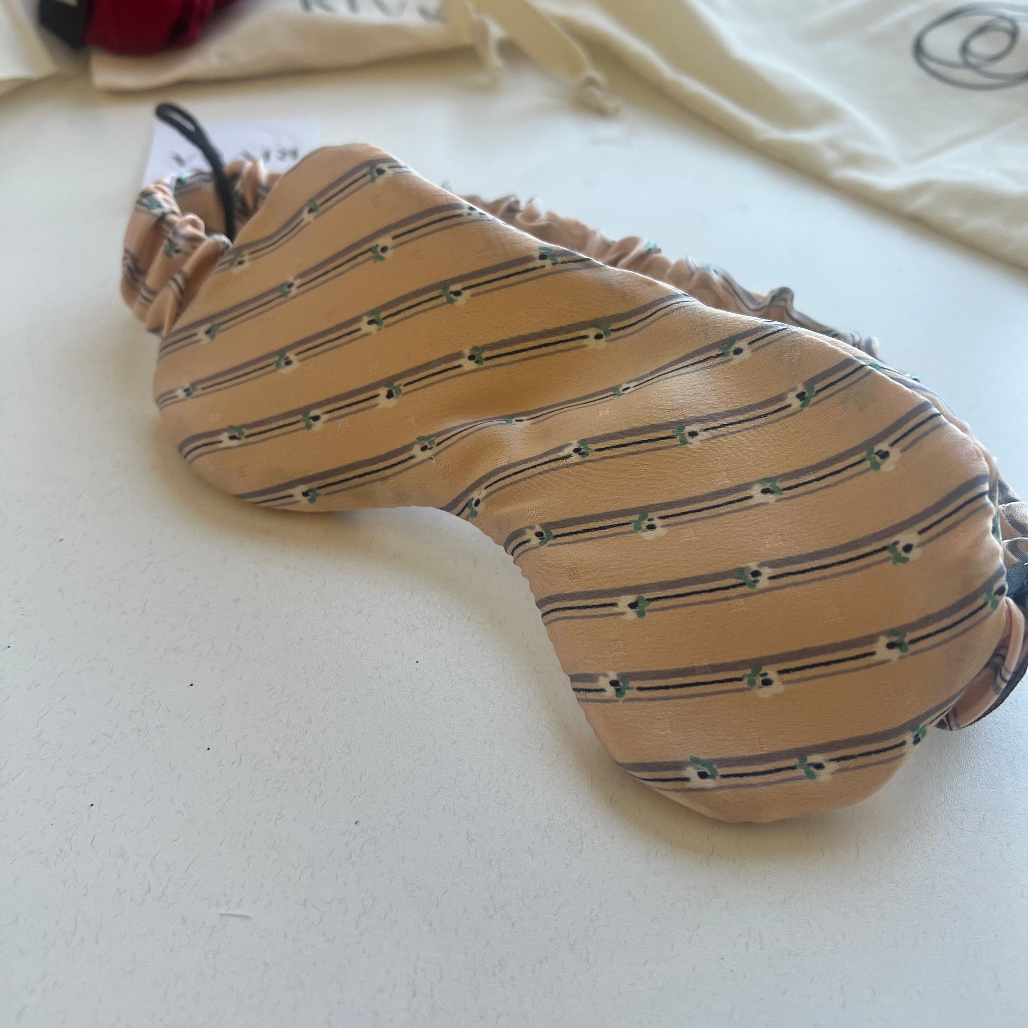 This mask is 100% silk. It’s a soft pink with little flowers, the interior is 100% wool for comfort and ease. Silk is known for both helping decrease fine lines and regulating temperature, making this mask perfect for sleep, take it with you anywhere with it's travel bag. The perfect gift for the traveler and lover of fashion and sustainability.