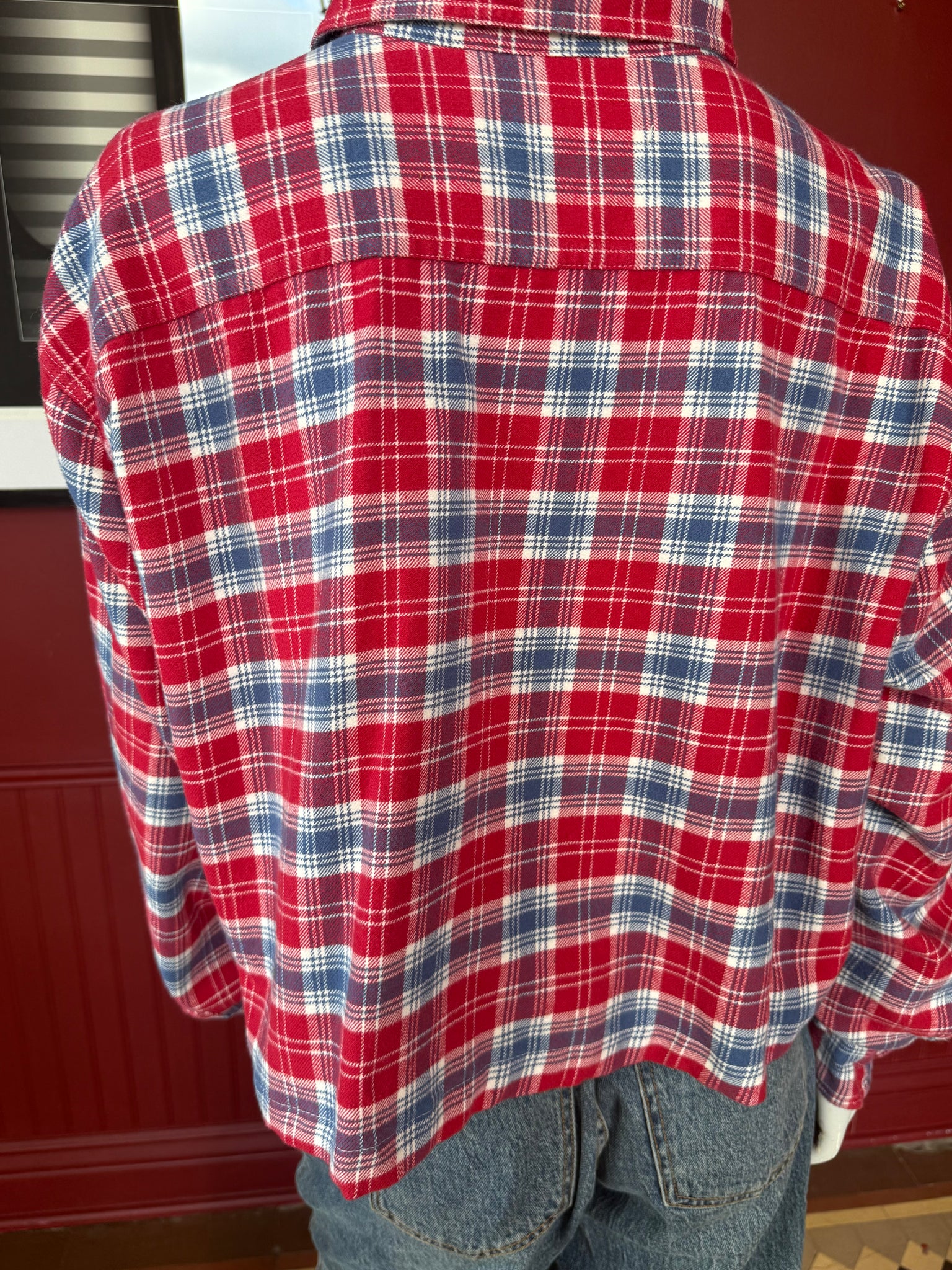 A fantastic color scheme, red blue, and white plaid. Cotton flannel double pockets.