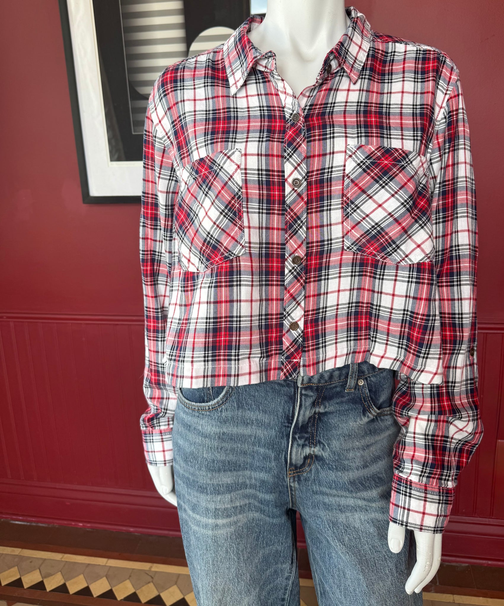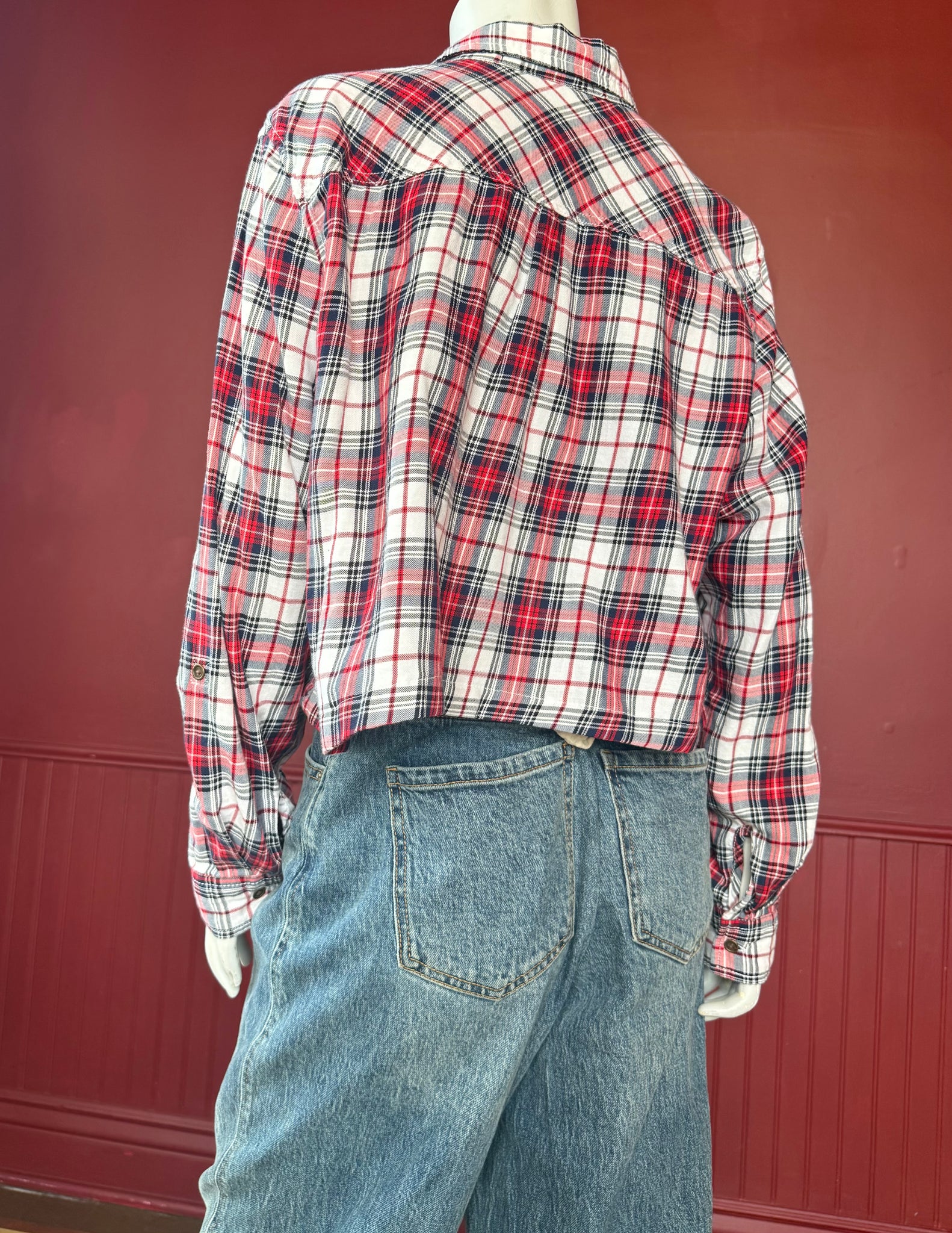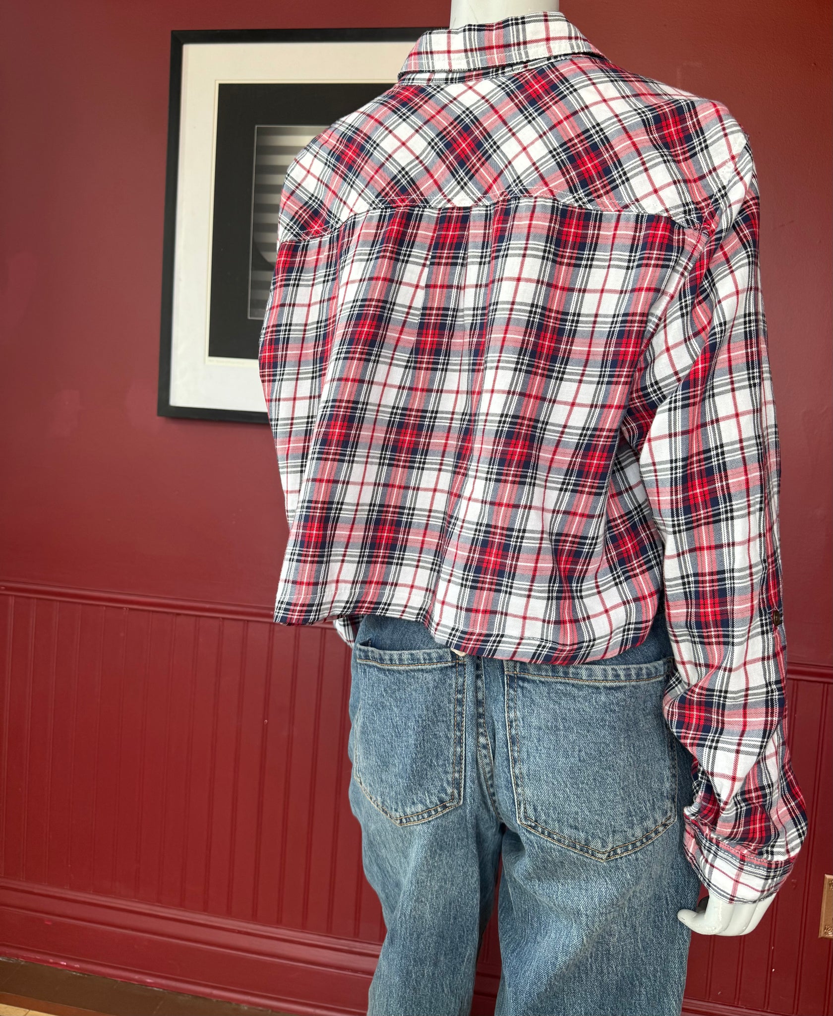 This is a lighter, white cotton flannel perfect for that transition season we’re in right now. A wonderful red and white plaid, double pockets. This one also has a little strap with button so you can roll up the sleeves.
