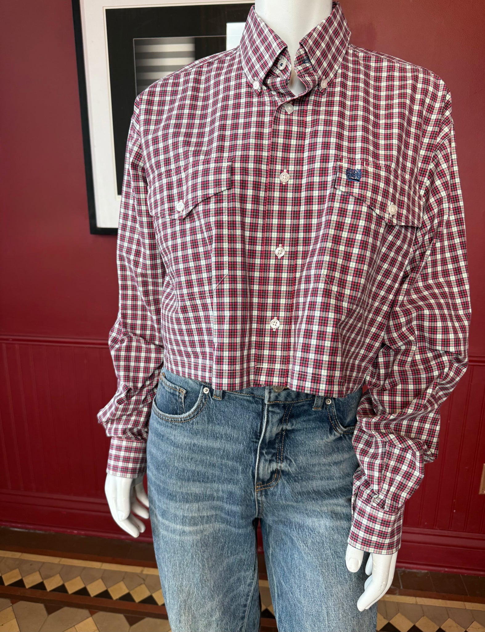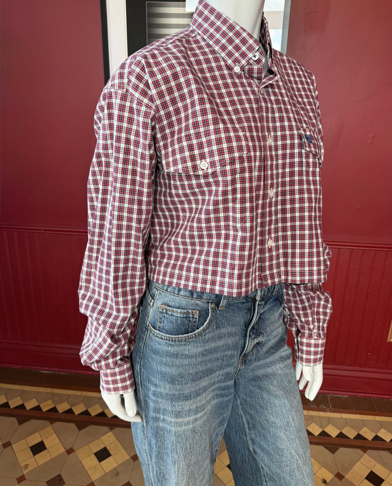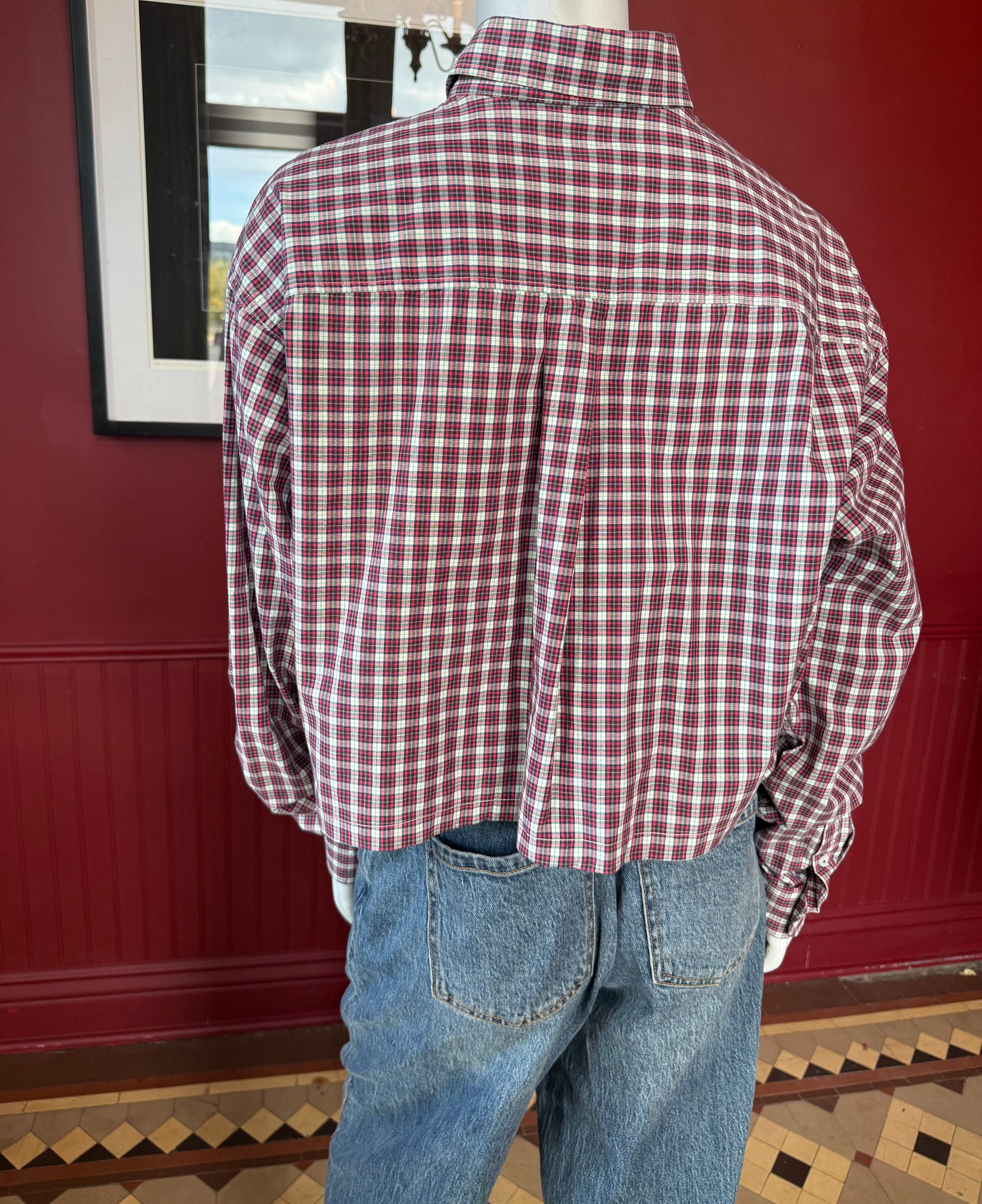 This fine plaid is a cotton and a great one with red white and green. Double pockets.